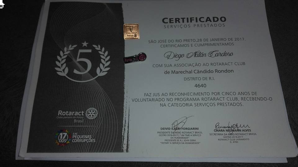 O Rotaract Marechal foi reconhecido pelo distrito por manter a tesouraria 100% e o companheiro Diego Cardoso recebeu o Pin de reconhecimento pelos 5 anos de serviços prestados ao clube.