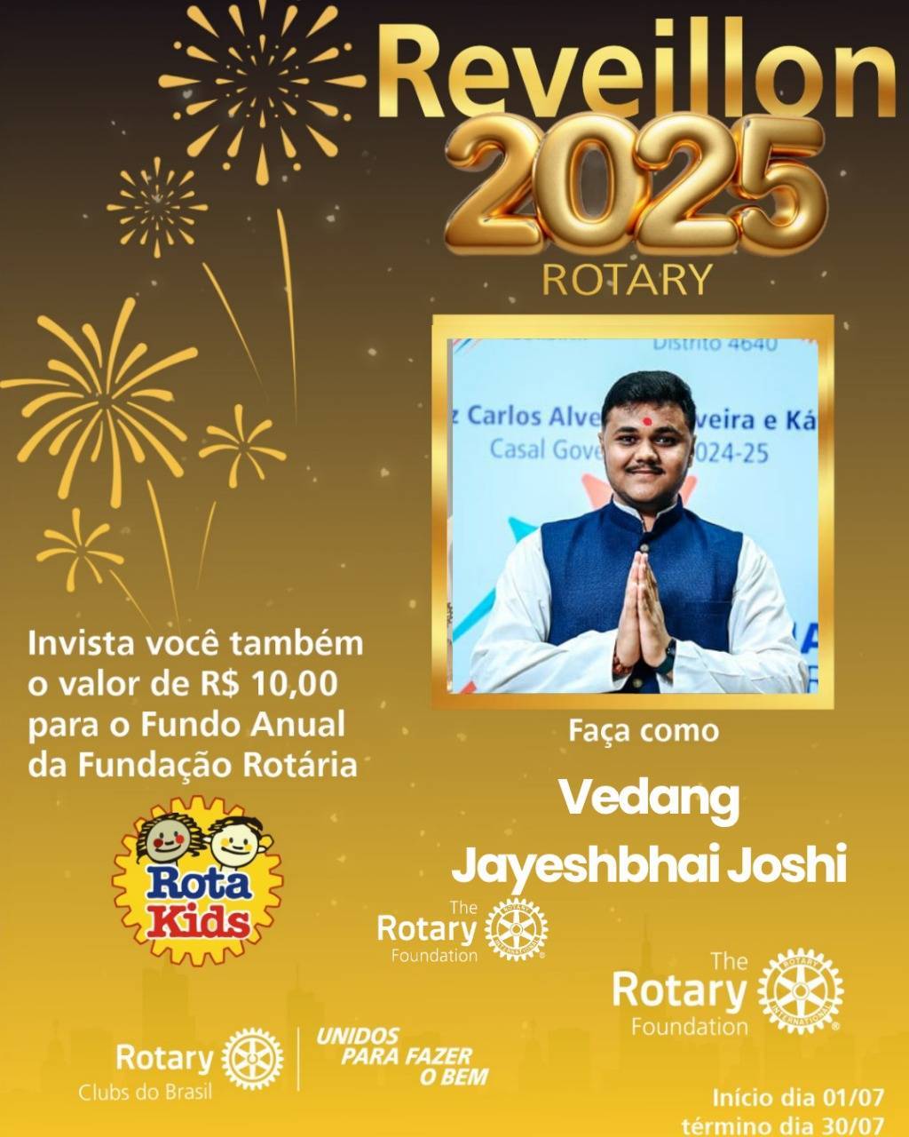 Com uma doação de *R$ 10,00* no Réveillon do Rotary, você está *dando o pontapé inicial* nas arrecadações para o *Fundo Anual da Fundação Rotária, que apoia projetos transformadores nas **áreas de enfoque*: